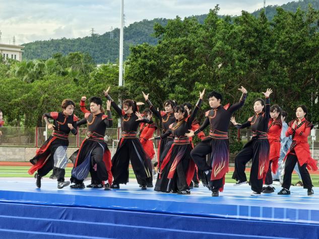 联排现场,舞蹈节目《破界、共生、致远》的排练堪称“青春与毅力的碰撞”。同学们全程保持高强度训练,眼神专注而坚定,从细腻传递传统文化内涵的手势眼神,到彰显青春活力的现代舞力量动作,每一个细节都力求精准规范。部分同学在练习高难度动作时不慎摔倒,却迅速起身继续,直至夕阳西下,操场上始终回荡着他们对艺术追求的热忱。