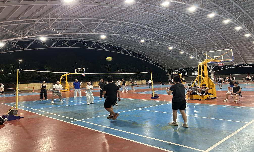 2025年11月12日晚,风雨球场内灯火通明。为迎接即将到来的体育欢乐节排球比赛,音乐学院刘静涵、李艺凡、钱圣杰、朱默涵、曹实五位教师齐聚于此,开展了一场紧张而热烈的赛前集训。尽管平日深耕于音乐教学与艺术创作,他们依然以全情投入的姿态,展现了音乐学院“艺术与健康同行”理念下的跨界活力。