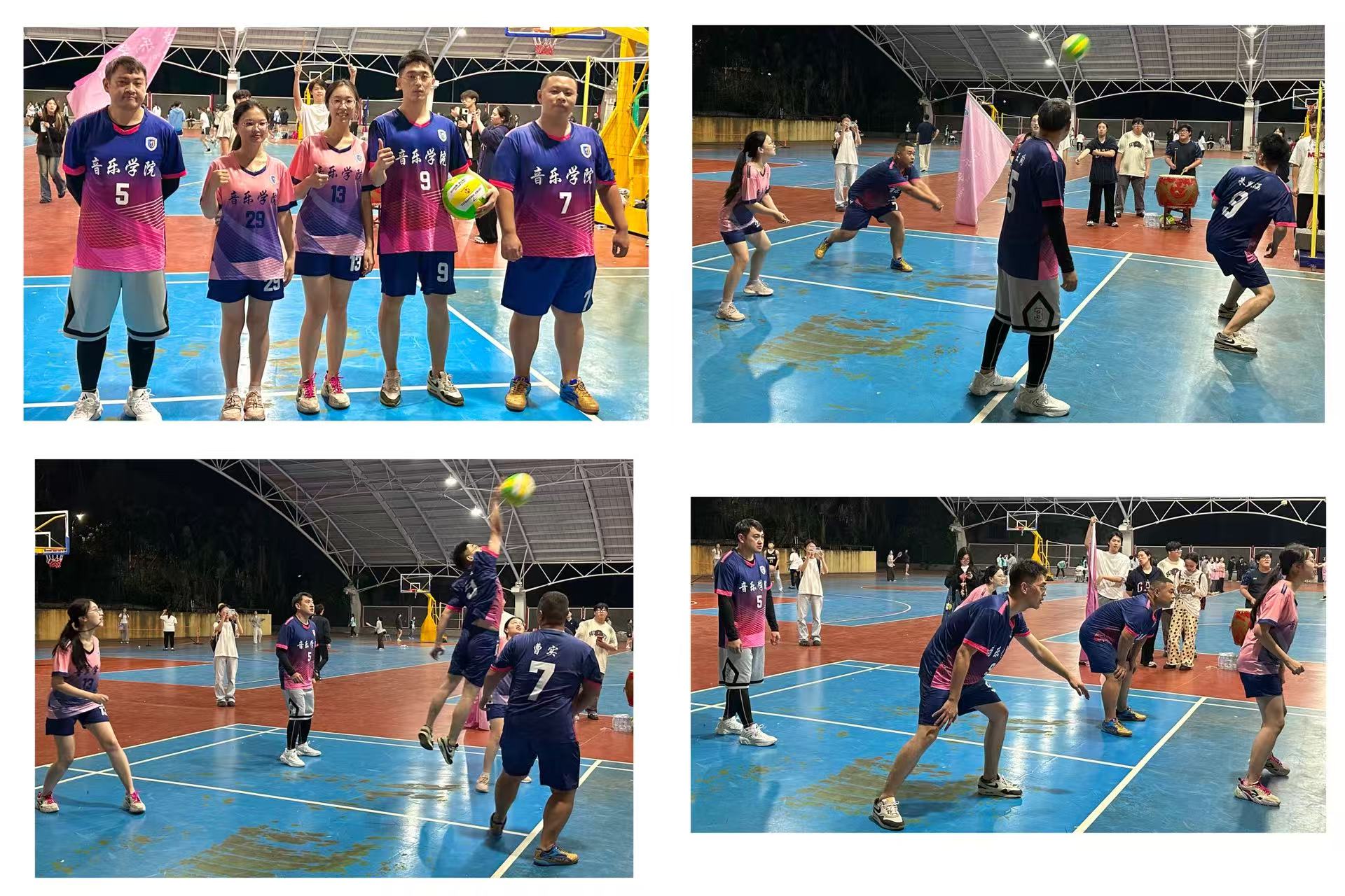 19:00,气排球第二场比赛开赛。音乐学院参赛的老师们依旧活力满满。他们在网前展开细密配合:垫球稳准、传球巧妙、扣杀有力,通过吊球、拦网等展开激烈的攻防博弈。场边“音乐学院”的紫粉色旗帜迎风招展,师生们的加油声此起彼伏,每一次精彩攻防都将赛事氛围推向高潮。