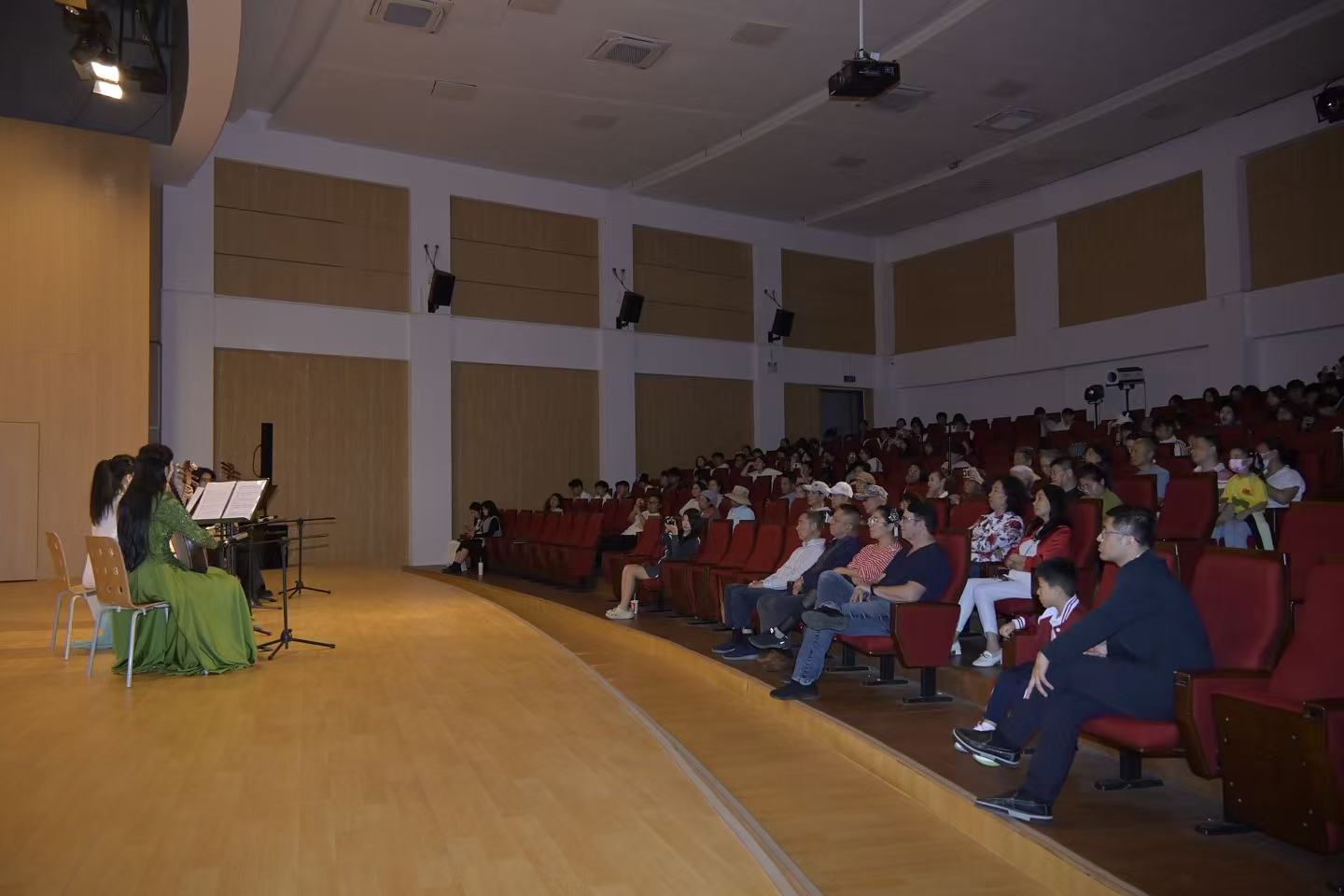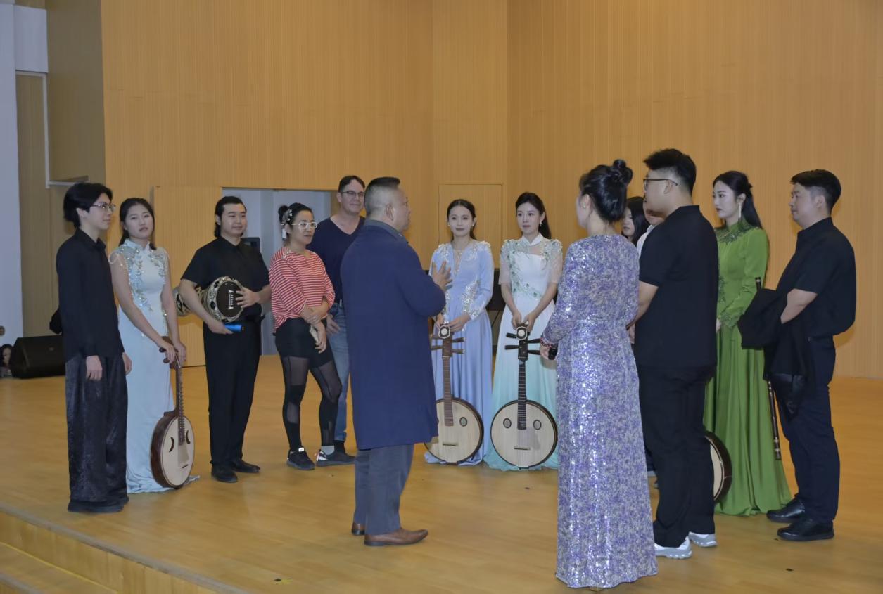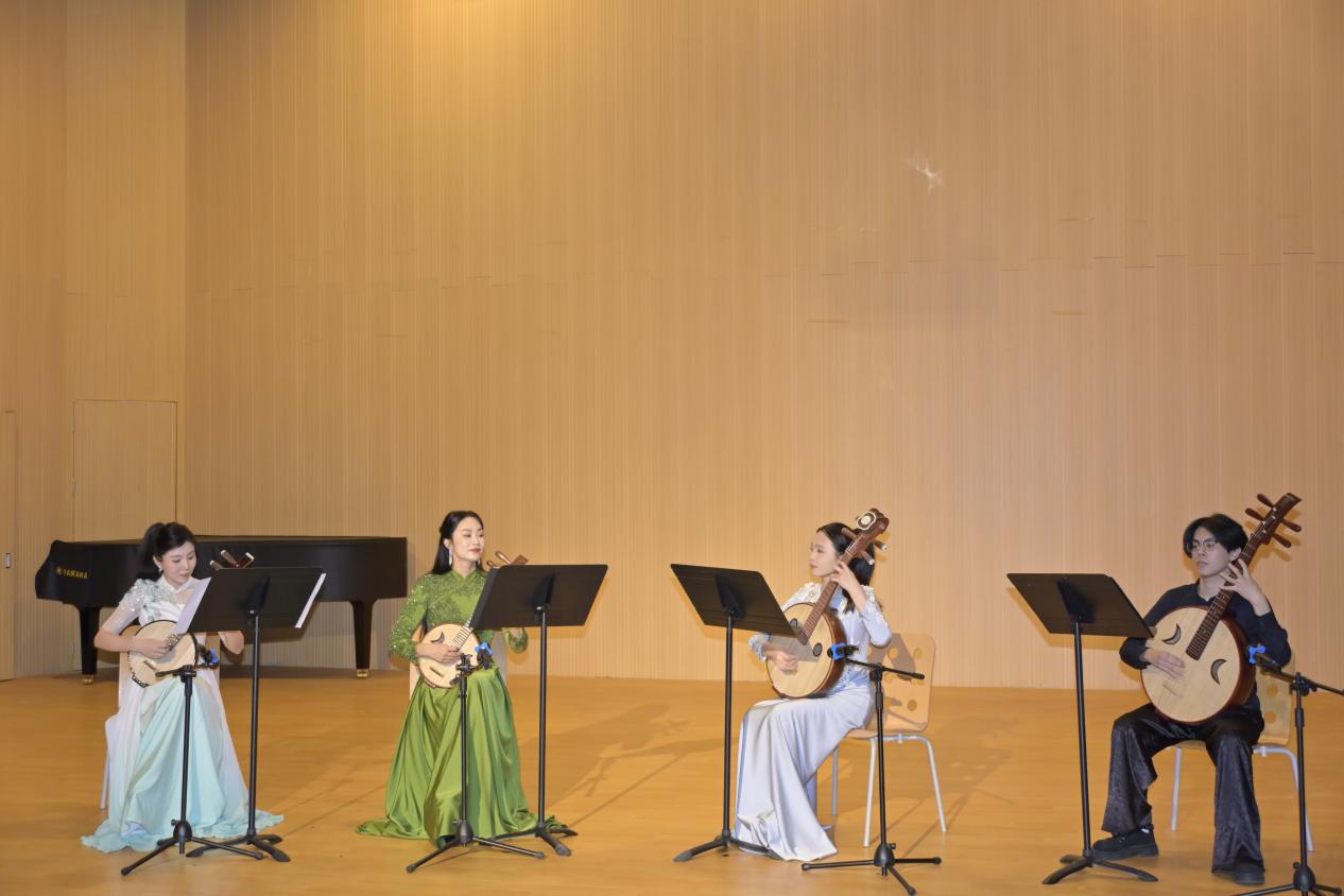 本场音乐会亮点纷呈、编排精妙,尽显民乐艺术的独特魅力与满满诚意。音乐会以阮族重奏的新颖形式打破独奏桎梏,将限定新篇与经典佳作巧妙融合,为观众开启了一段裹挟椰风海韵的沉浸式音乐之旅。由我院院长张巨斌作曲,古筝老师张骋骋、竹笛专业副教授徐升演奏的《梦之蝶》,写尽了雅致的诗情画意;魏巍老师带来的《新赛马》,则尽显草原儿女的豪情万丈。压轴作品《丝路驼铃》更以阮族合奏融合雄浑打击乐,铺展出古丝路苍茫辽阔的意境,令人沉醉不已。