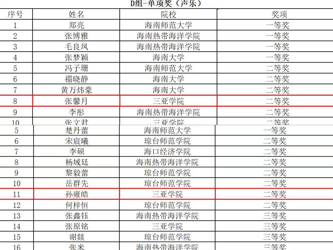 为夯实音乐专业基础根基,深化产教融合育人模式,以项目制教学赋能学子专业成长,搭建全省高校艺术交流共进平台,2025 年 10 月18日,由海南省教育厅主办、海南师范大学承办的海南省第四届普通高等院校音乐专业师生基本功大赛顺利进行。音乐学院汪梅娟教授精心选拔本科组孙雍皓、研究生组张馨月两名同学参赛,二人依托学院产教融合培育体系与项目制教学积累的扎实功底,均斩获二等奖,生动彰显了学院创新育人模式的显著成效与学子的综合素养。