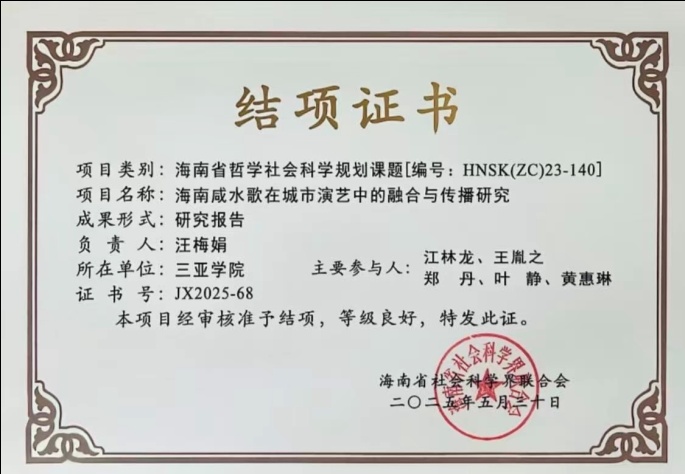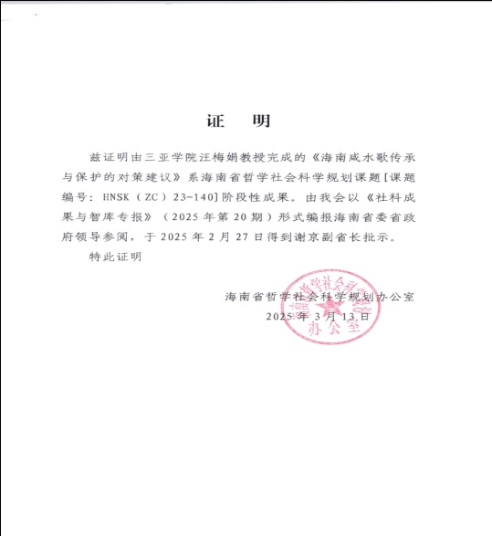 此次成果获省级领导批示,既是对高校服务地方文化建设的有力肯定,也为海南非遗保护事业提供了重要的理论支撑与实践路径。未来,三亚学院将持续深化教学科研融合,推动咸水歌等非遗文化融入现代生活,为海南自贸港文化建设贡献更多高校智慧与力量。