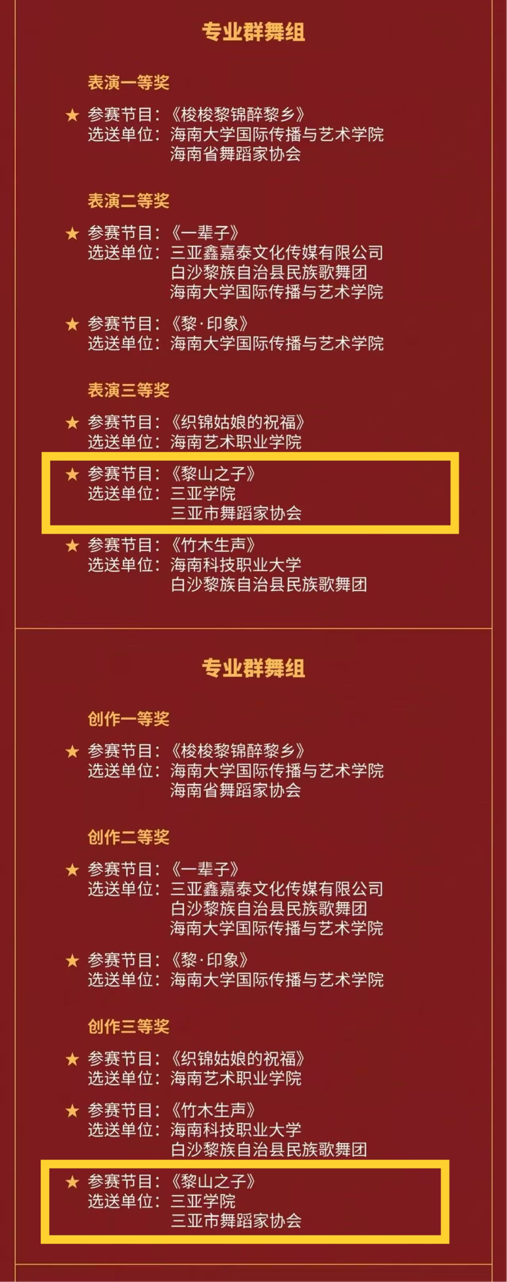 近日,由海南省文学艺术界联合会主办、海南省舞蹈家协会承办、琼台师范学院音乐学院协办的"第四届海南省原创舞蹈大赛"圆满落幕。三亚学院音乐学院舞蹈编导专业选送的原创舞蹈作品《黎山之子》表现优异,一举斩获"专业群舞组表演三等奖"和"专业群舞组创作三等奖"两项荣誉。